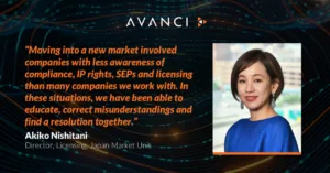 News Meet Akiko Nishitani August 26, 2025 / November 18, 2025 by Avanci Meet Akiko Nishitani! She is a Licensing Director in our Japan Market Unit, working with a range of stakeholders to... Read more » Avanci Aftermarket Avanci Broadcast Avanci IoT Avanci Solutions Avanci Vehicle Avanci Video