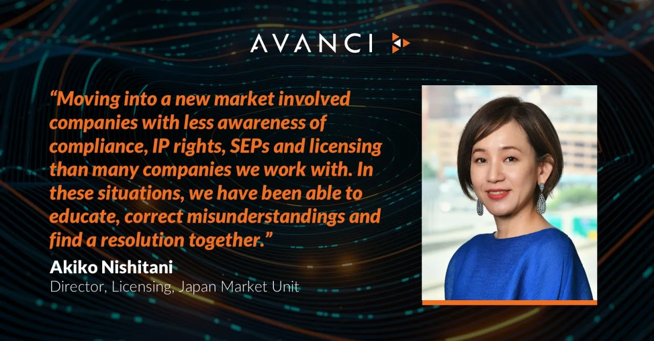 Meet Akiko Nishitani! She is a Licensing Director in our Japan Market Unit, working with a range of stakeholders to support Avanci’s vision of transforming how patent licensing is done.